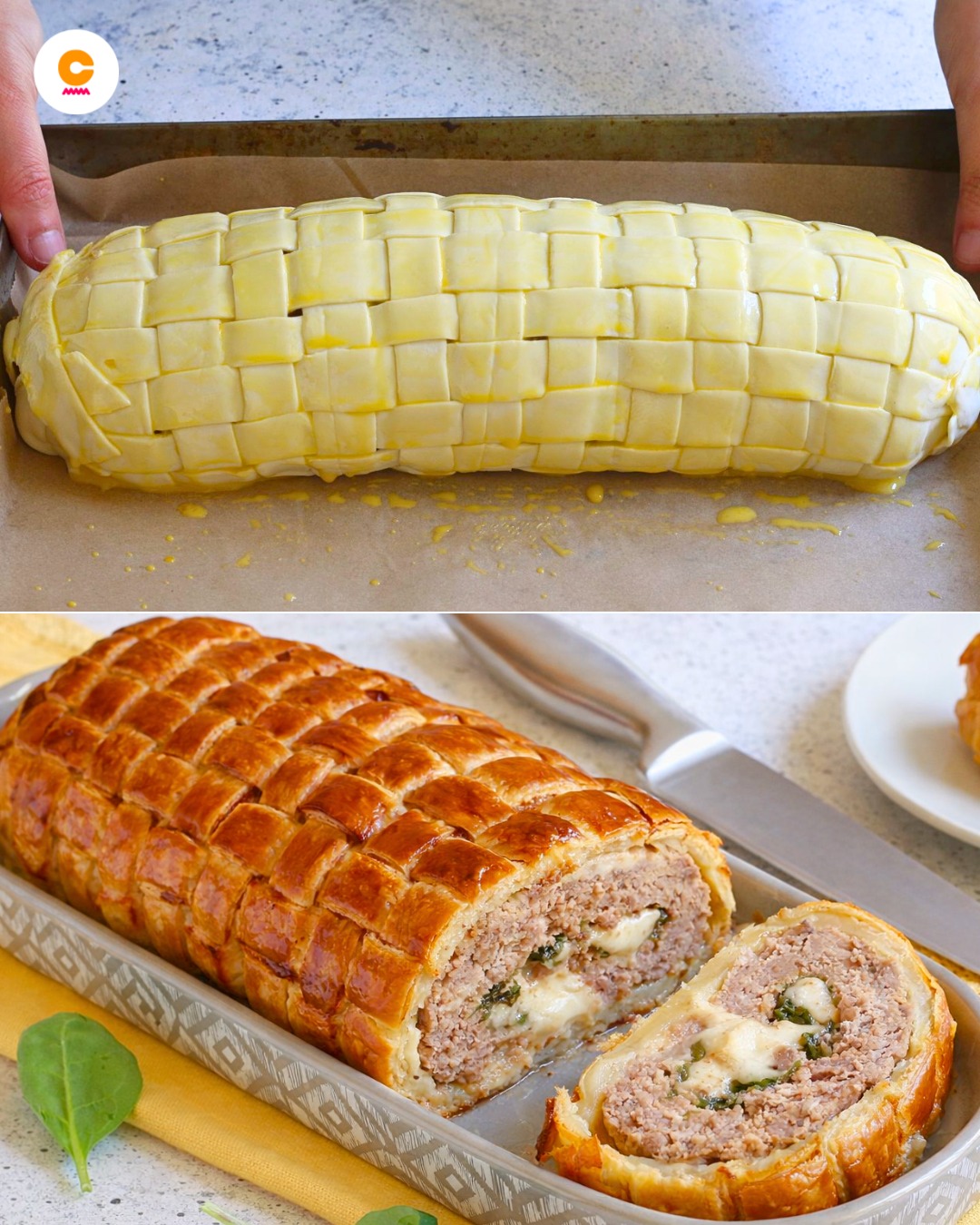 Il polpettone in crosta è una portata scenografica e golosa, perfetta per il pranzo della domenica e per le occasioni speciali. Si tratta di una sfiziosa rivisitazione del classico polpettone di carne, in questo caso avvolto da una crosta croccante di sfoglia. L'impasto, a base di carne macinata, pane, uova e formaggio, accoglie un ripieno di spinaci e scamorza, per un risultato dal cuore tenero e filante. Il tutto viene ricoperto da un dorato guscio di pasta sfoglia, gustoso e decorativo al tempo stesso grazie al particolare intreccio.
