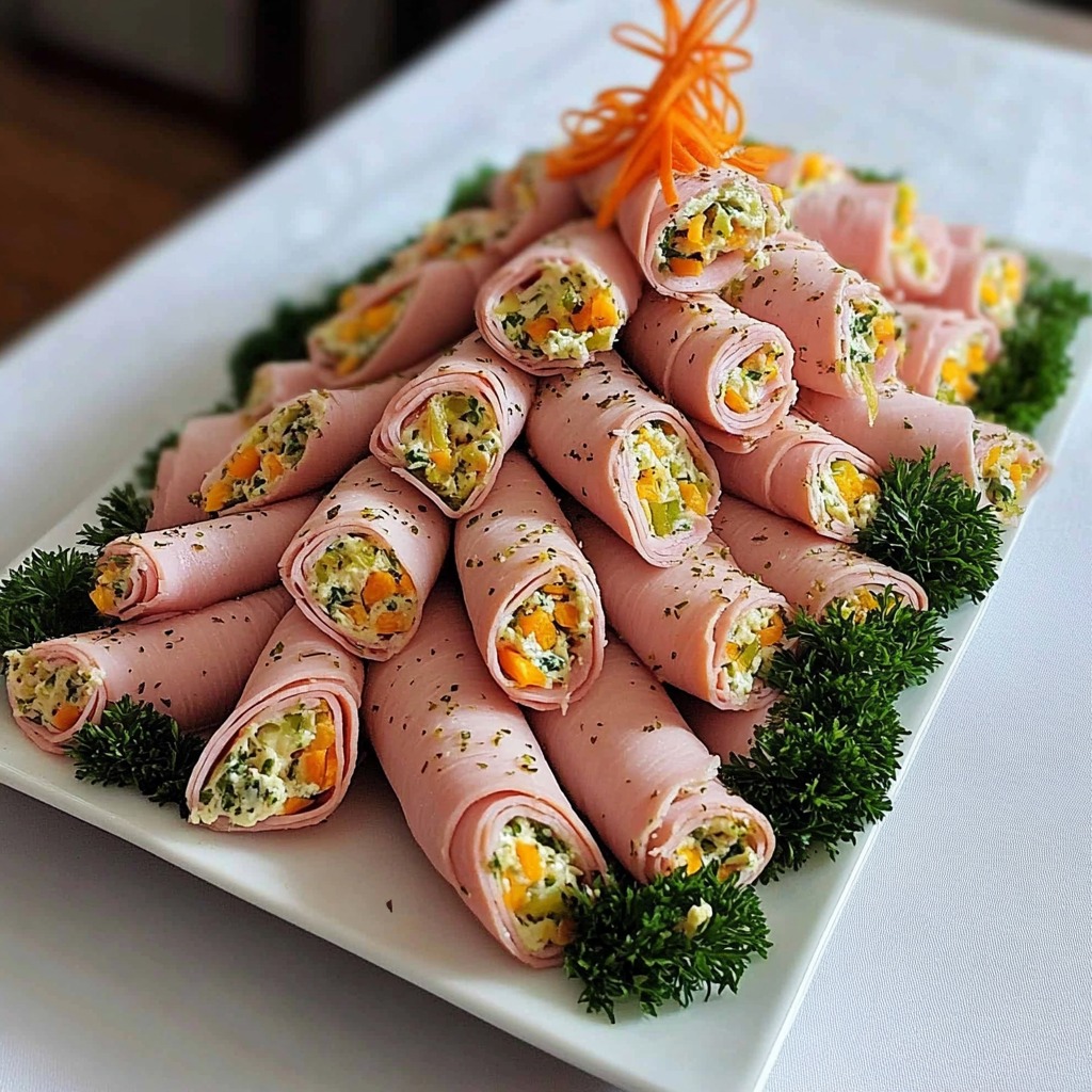 Parsemer d’herbes séchées sur les roulés. Disposer le persil frisé autour pour imiter les branches du sapin. Ajouter quelques lamelles fines de carotte au sommet pour la touche finale.