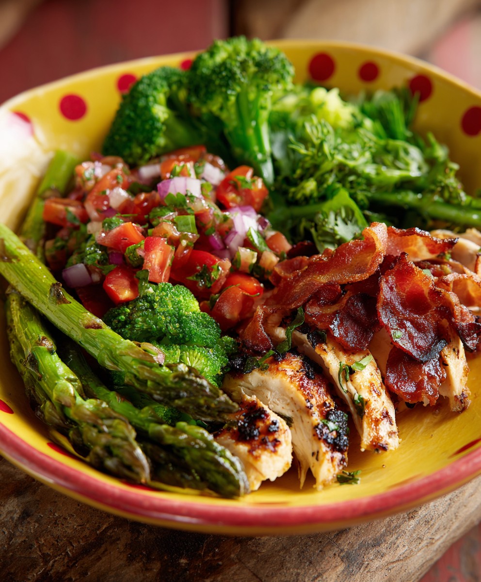 : en un plato hondo coloca el pollo a un lado, el tocino encima, los espárragos y el brócoli alrededor, y al centro una buena porción del pico de gallo fresco.