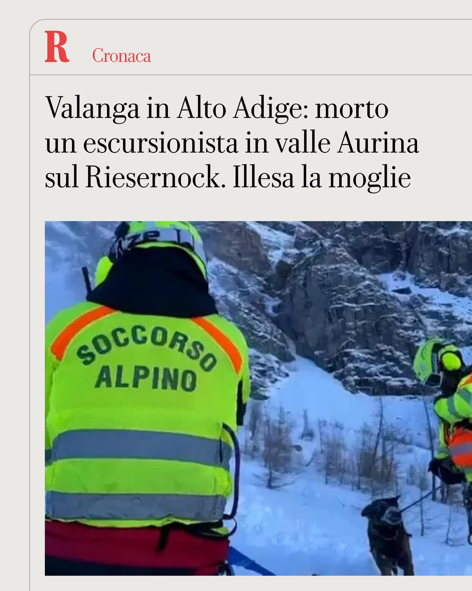 Un uomo è morto travolto da una valanga che si è staccata nel tardo pomeriggio in valle Aurina sul Riesernock, in Alto Adige. Secondo una prima ricostruzione dei fatti, una coppia di escursionisti stava rientrando a valle lungo il sentiero 8 'Arthur Hardegen', quando a circa 2.500 metri di quota si è staccata una slavina che ha trascinato l'uomo per circa 200-300 metri, mentre la moglie è solo stata sfiorata ed è rimasta illesa. L'allarme è stato lanciato verso le ore 17. Sul posto sono intervenuti il Soccorso alpino della Guardia di finanza con l'elicottero Pelikan 2, come anche i Carabinieri e i Vigili del fuoco, ma l'uomo era ormai deceduto.