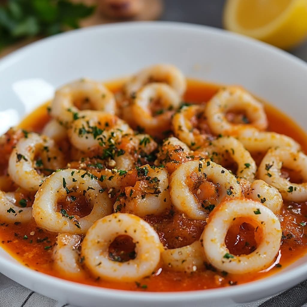 Couvrez et laissez mijoter à feu doux pendant environ 20 à 25 minutes, jusqu’à ce que les calamars soient tendres et la sauce bien réduite.