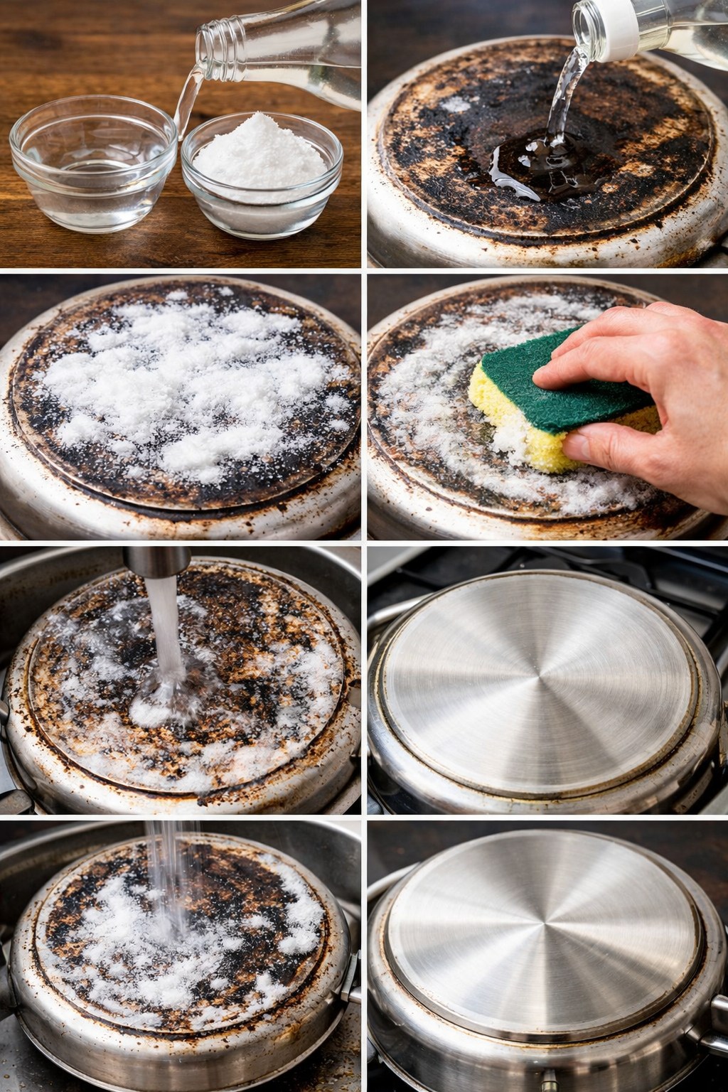 Para hacer la solución milagrosa en casa, debes combinar vinagre de vino blanco y bicarbonato de sodio . Se mezclan en un vaso, se agrega agua y luego se frota la mezcla en el fondo de las sartenes y ollas, posiblemente con una esponja áspera. Con esto vas a raspar la suciedad con cuidado y delicadeza para no atacar el material y no dañarlo.