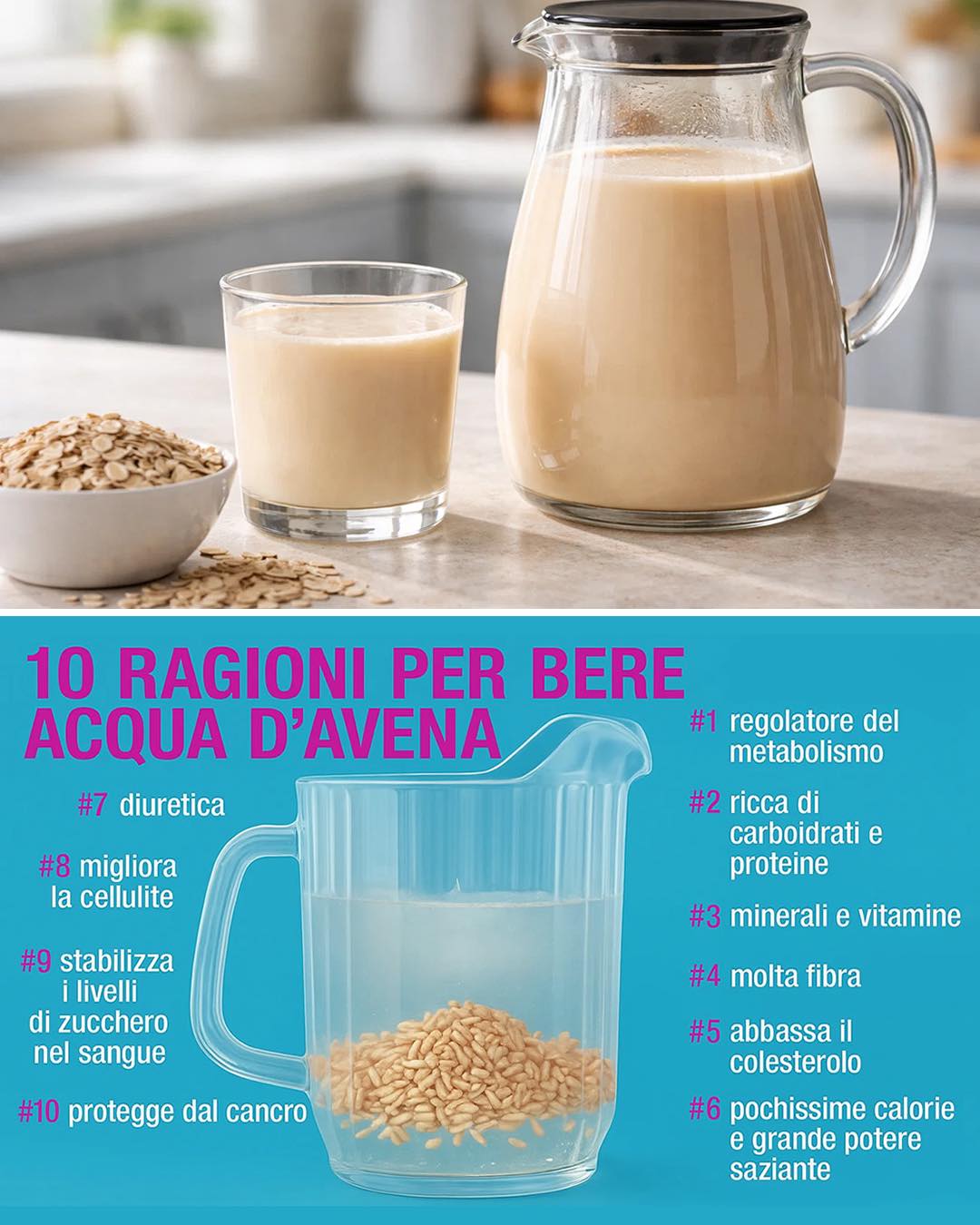 Ti basta 1 tazza di fiocchi d’avena integrale e 1 litro d’acqua. Metti l’avena in ammollo per almeno 6-8 ore (o tutta la notte). Trascorso il tempo, frulla tutto insieme, poi filtra il liquido con un colino fine o una garza. Conserva in frigo e bevi 1-2 bicchieri al giorno, preferibilmente a digiuno o prima dei pasti.