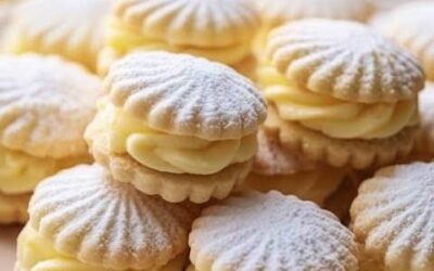 Biscuits sablés à la crème de citron Ces petits gâteaux dentelés sont garnis d'une crème onctueuse au citron et saupoudrés de sucre glace pour une touche de douceur.
