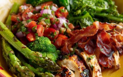 Ingredientes :Pechuga de pollo a la parrilla Tocino crujiente Brócoli Espárragos verdes Tomate Cebolla morada Cilantro fresco Aceite de oliva…
