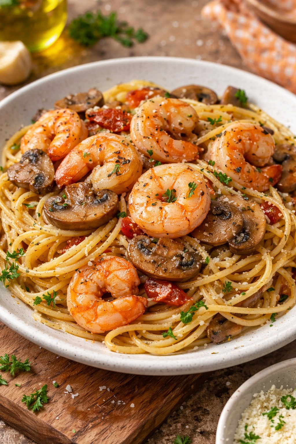 Esta pasta al ajillo con gambas y champiñones combina aromas profundos de ajo dorado, un toque picante de guindilla y la jugosidad del mar con la suavidad de los champiñones. Es un plato rápido pero elegante, perfecto para una cena entre semana que sabe a celebración. La salsa se liga con el propio almidón de la pasta, un chorrito de vino blanco y un final de mantequilla y perejil que la vuelve sedosa y fragante. Cada bocado es equilibrado: las gambas quedan tiernas, los champiñones aportan cuerpo y el limón despierta todos los sabores. Lista en menos de media hora, es una receta que luce sin complicaciones y conquista a cualquiera en la mesa.