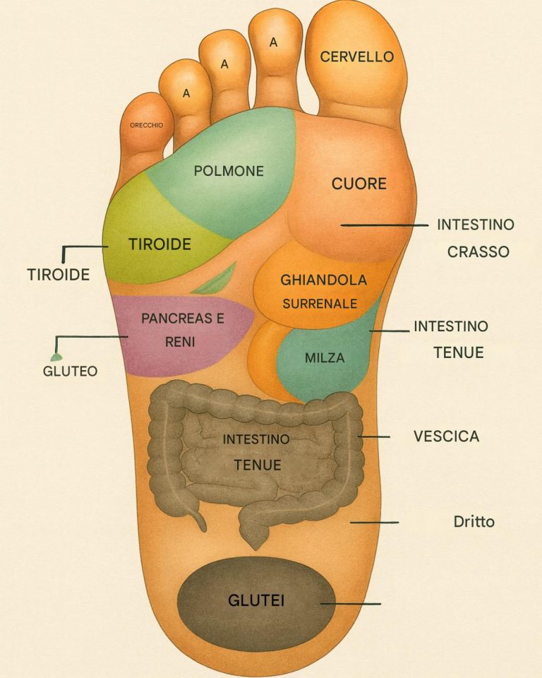 Le piante dei piedi contengono centinaia di terminazioni nervose, collegate a diversi organi del corpo (come mostrato nella tabella di riflessologia qui sopra). Secondo la medicina tradizionale: