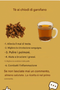 5-6 chiodi di garofano 1 tazza di acqua tiepida Facoltativo: un po' di miele o limone per addolcire il sapore Preparazione: Far bollire l'acqua. Aggiungere i chiodi di garofano e lasciarli in infusione per 10-15 minuti. Filtrare e gustare caldo, preferibilmente al mattino o dopo un pasto. Precauzioni per l'uso: Non consumare troppo: 1 tazza al giorno è sufficiente. Non raccomandato per donne in gravidanza, bambini e persone con ulcere gastriche. In caso di dubbi, consultare il medico prima di utilizzare regolarmente.